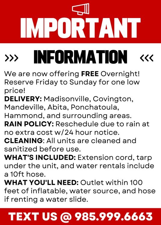 - RAIN POLICY: You can reschedule your rental due to rain at no extra cost as long as 24 hour notice is given.