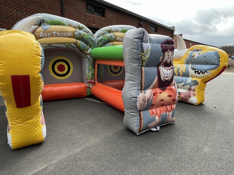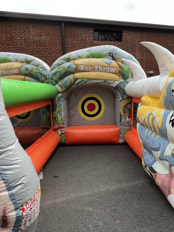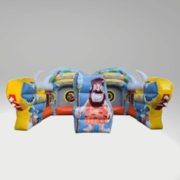 This 2 player inflatable axe throw rental is perfect for any party from the backyard parties and school, church and corporate events. This axe throw game features two separate throwing lanes and bullseyes to you can compete with your friends. It's fun dinosaur and caveman graphics will be a hit of the party, so don't wait to book!