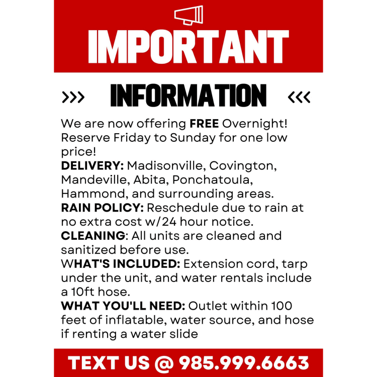 - Water source and water hose if renting a water slide
